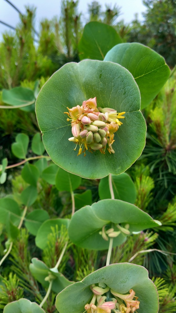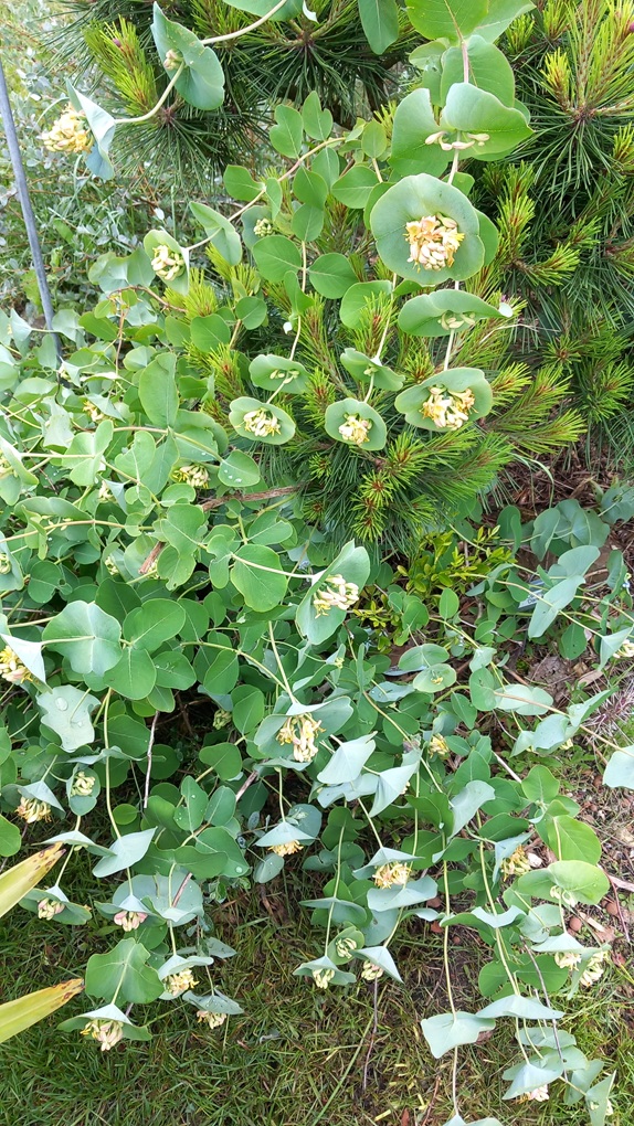 Een bijzondere kamperfoelie, het zilvergrijze schutblad van de bloemen heeft veel weg van Eucalyptusblad.