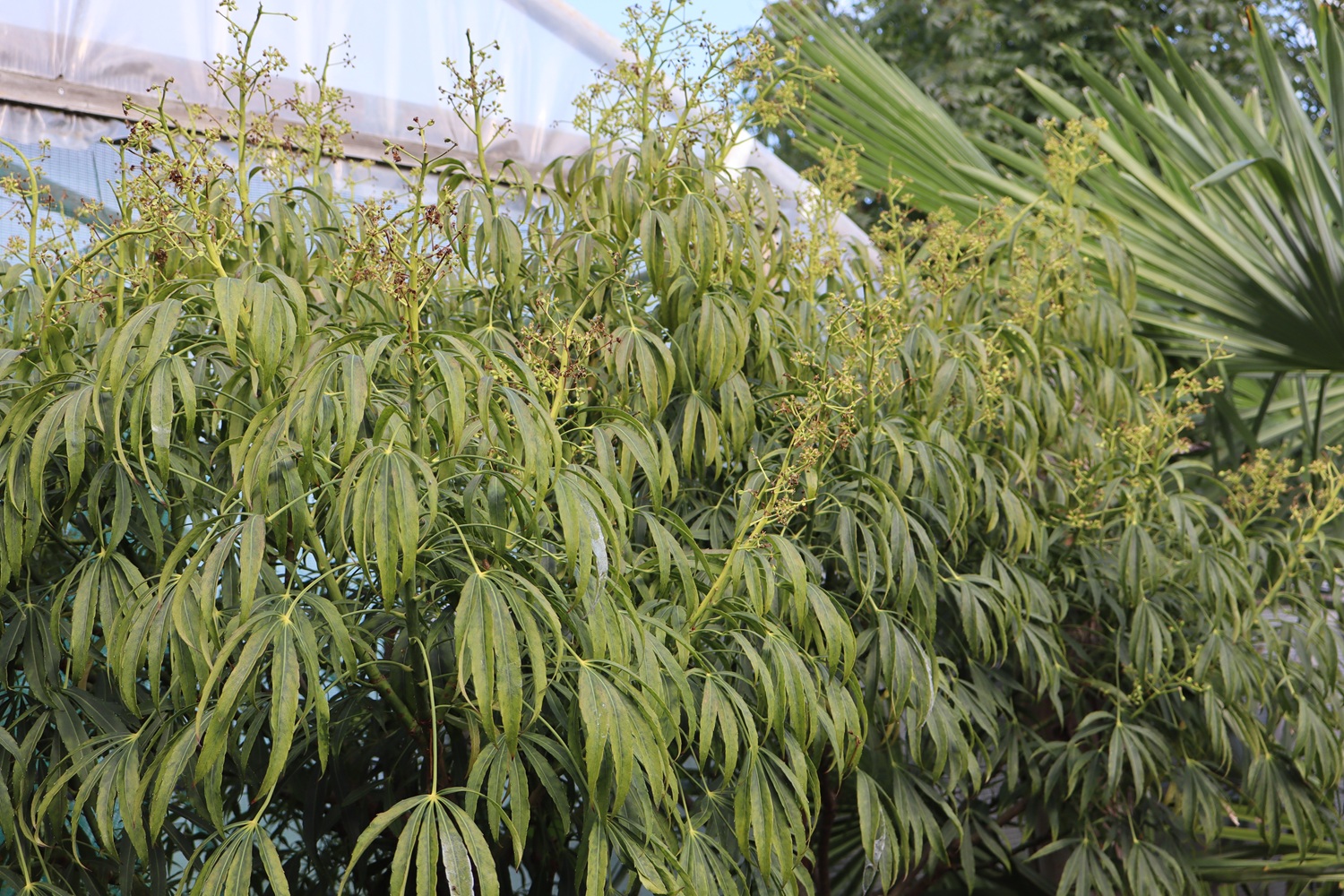 Wintergroene struik of kleine boom uit China met fijnverdeeld palmachtig blad. Staat bij ons op de kwekerij al jaren buiten uitgeplant zonder bescherming en heeft nooit schade gehad. Zou tot min 15 graden vorst moeten kunnen overleven.